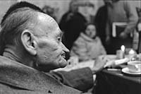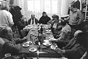 man sich wieder Tee, Stollen und Zigaretten zu und weist Neuankömmlinge zurecht: Tür zu,