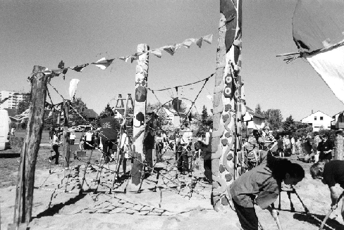 Friedensnetzes: Holzpfeiler, die von Schülern und Schülerinnen