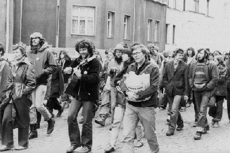 Ostermarsch Bamberg-Nürnberg 1982: Jürgen Politz mit Gitarre.